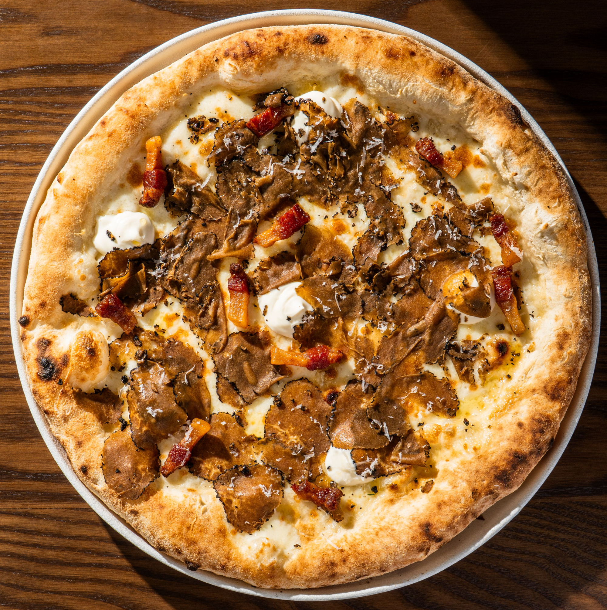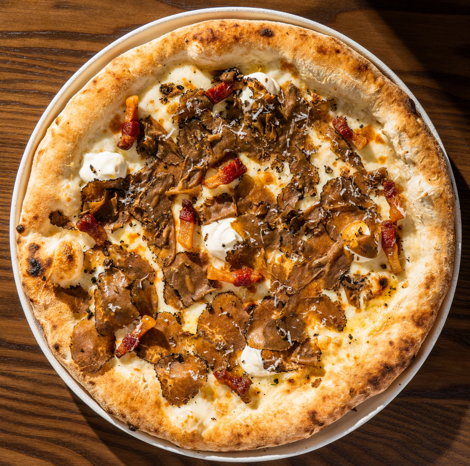 Five Mushroom Pizza with truffle, fior di latte, truffle cream sauce.
