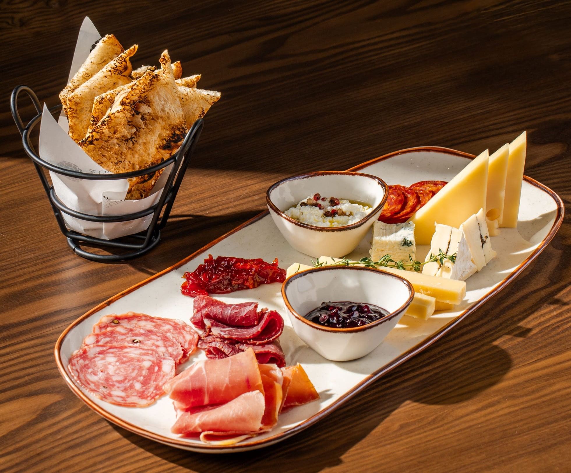 selective cheeses and cold cuts with nuts, homemade wild berry jam, chili jam