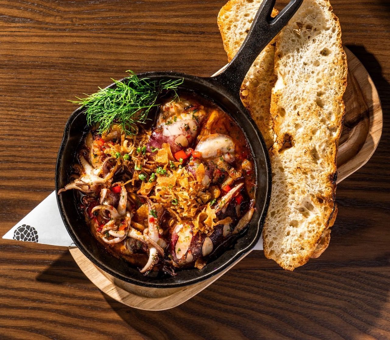 baby squid, garlic, chili, crispy onion flakes, crispy focaccia