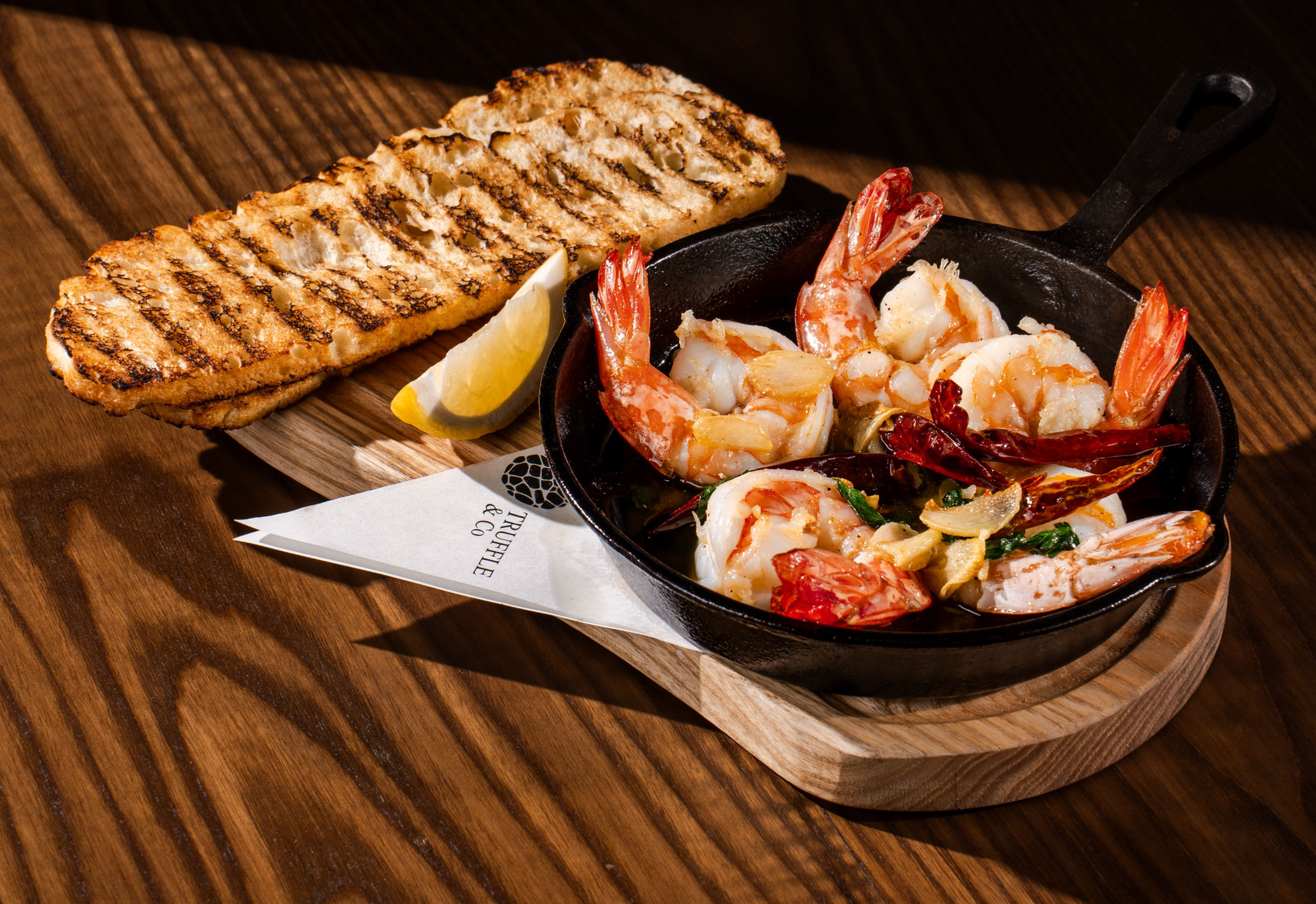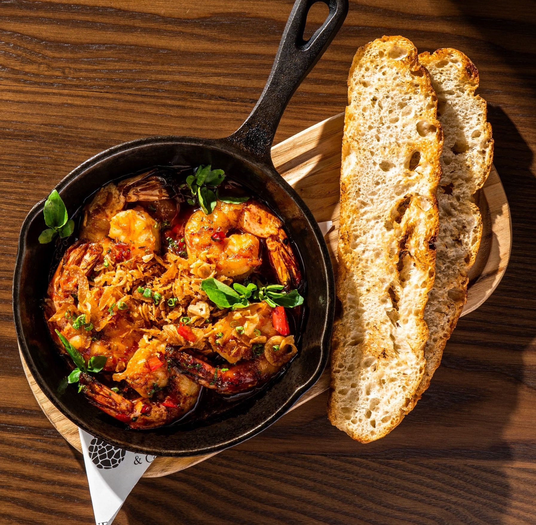 grilled prawn, chili, garlic, crispy onion flakes, crispy focaccia