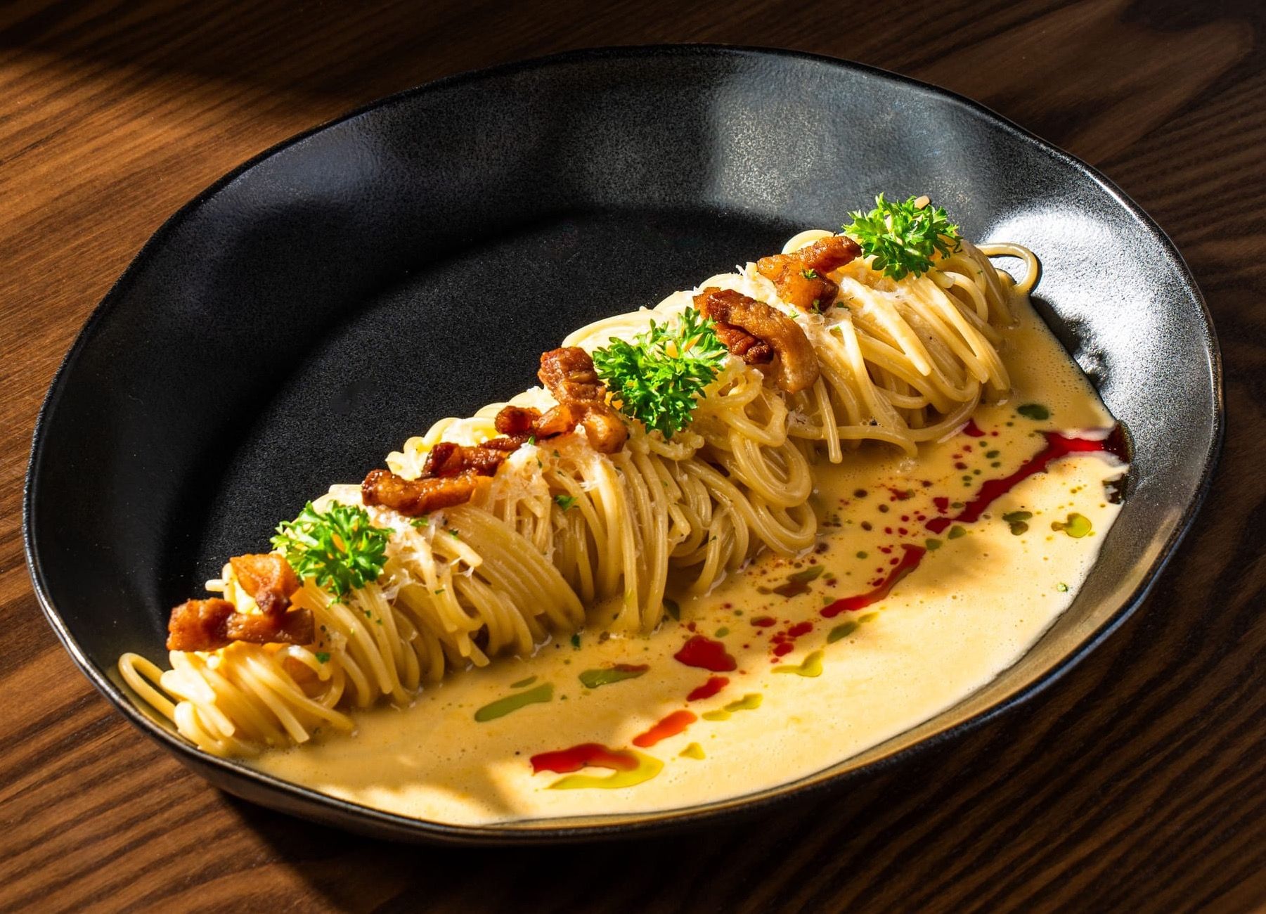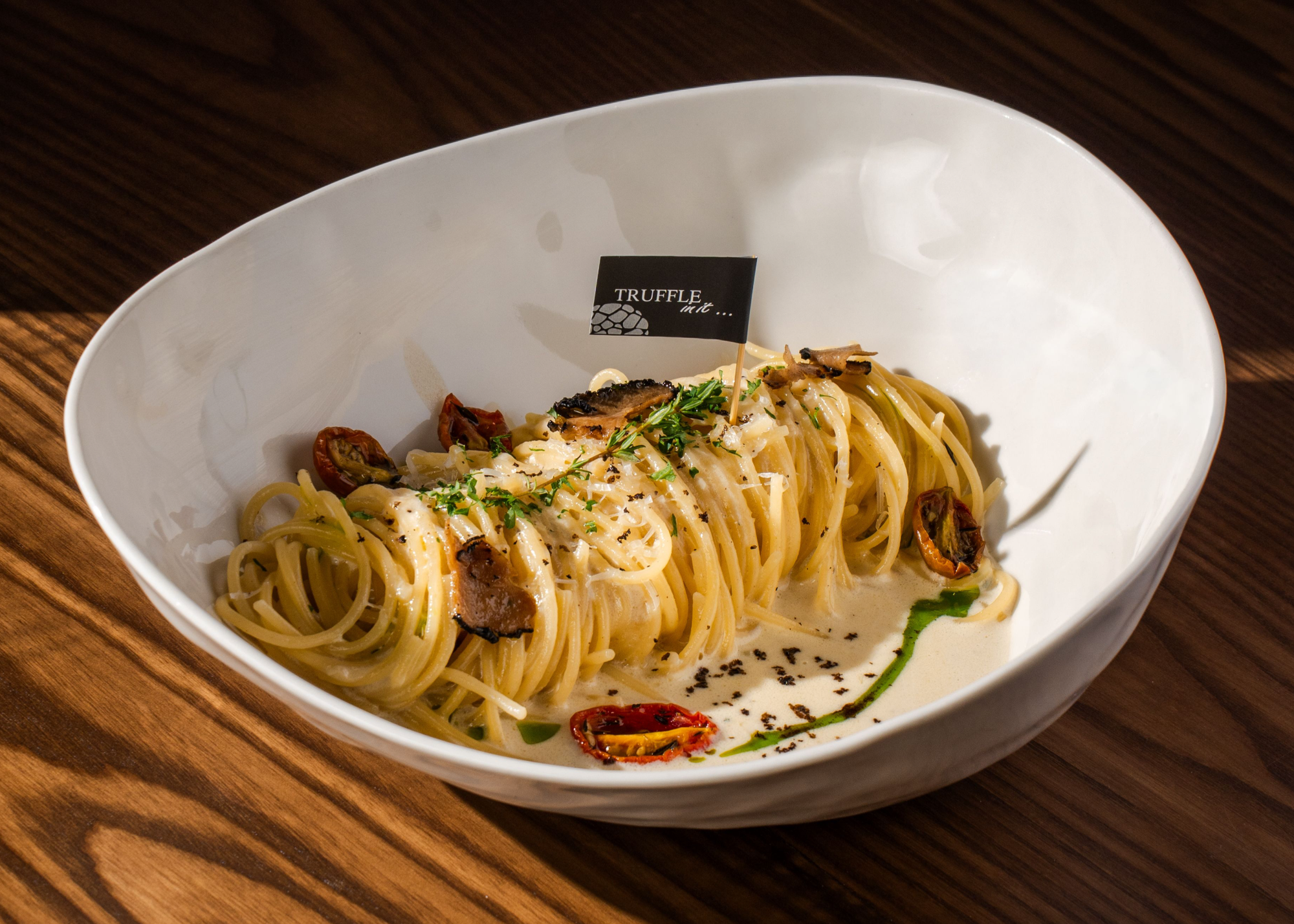 spaghetti, cream sauce, mushroom, truffle, crispy guanciale, parmesan