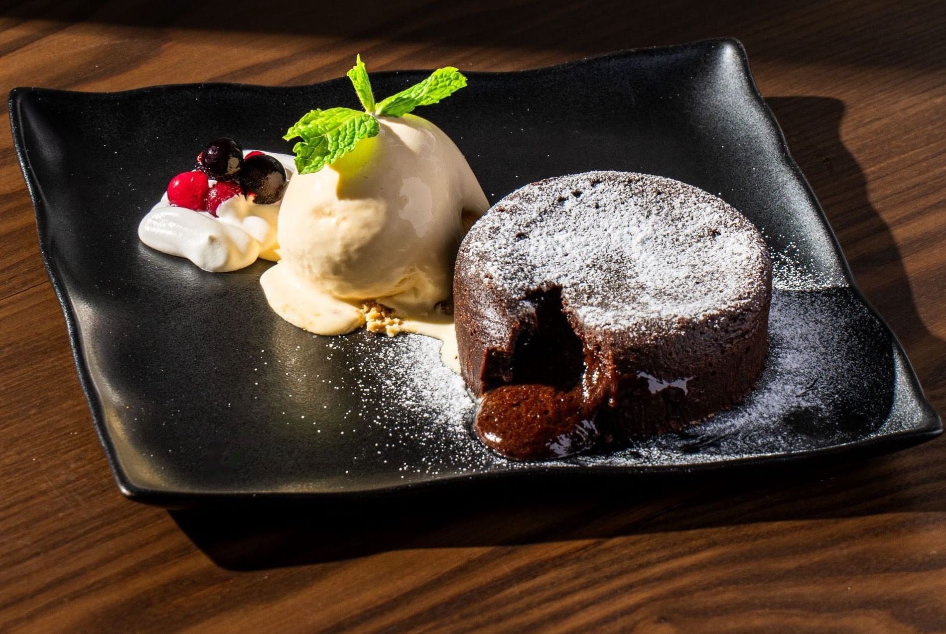 ricotta cheese lava cake with vanilla gelato and wild mix berry sauce