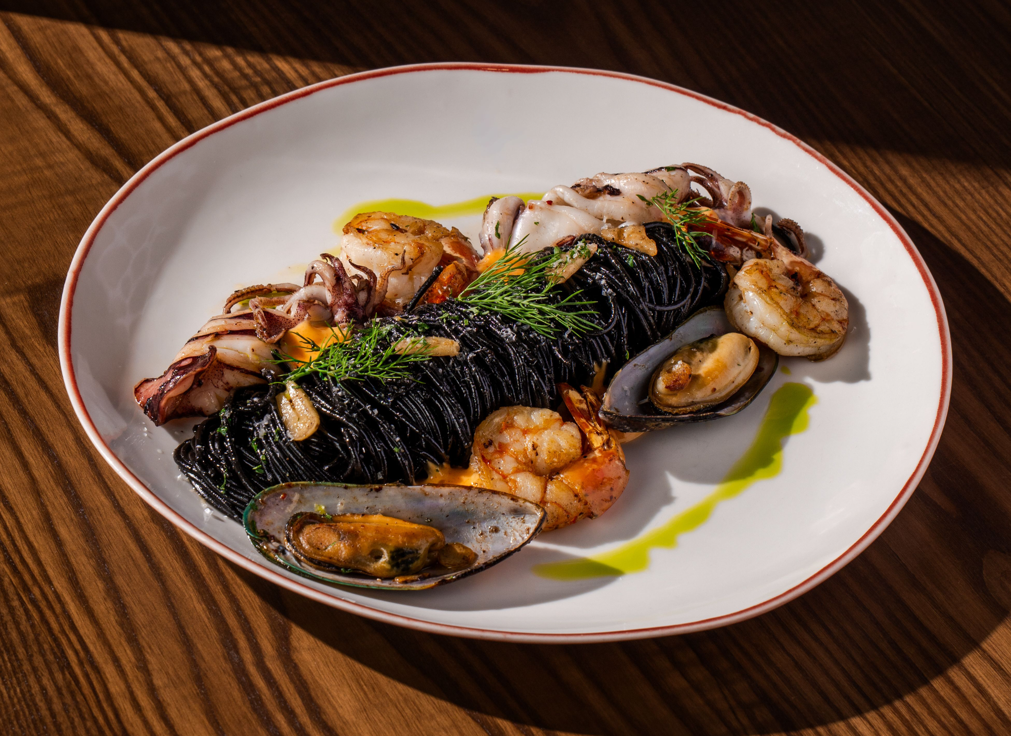 black spaghetti, prawn, squid, mussels, garlic, chili, olive oil, parmesan