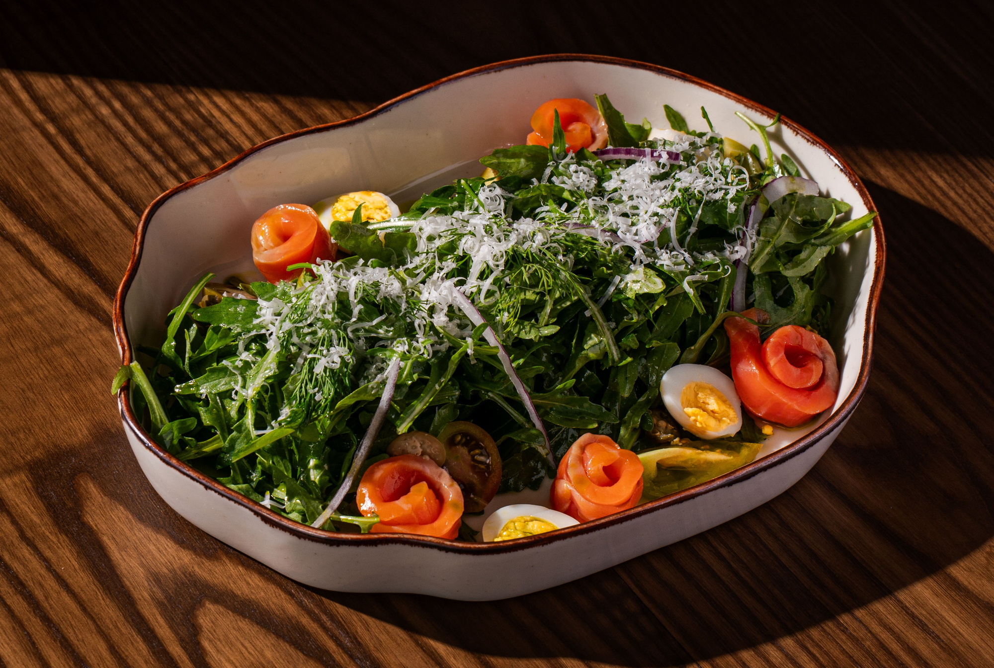 rocket, smoked salmon, quail eggs, cherry tomatoes, red onion, parmesan