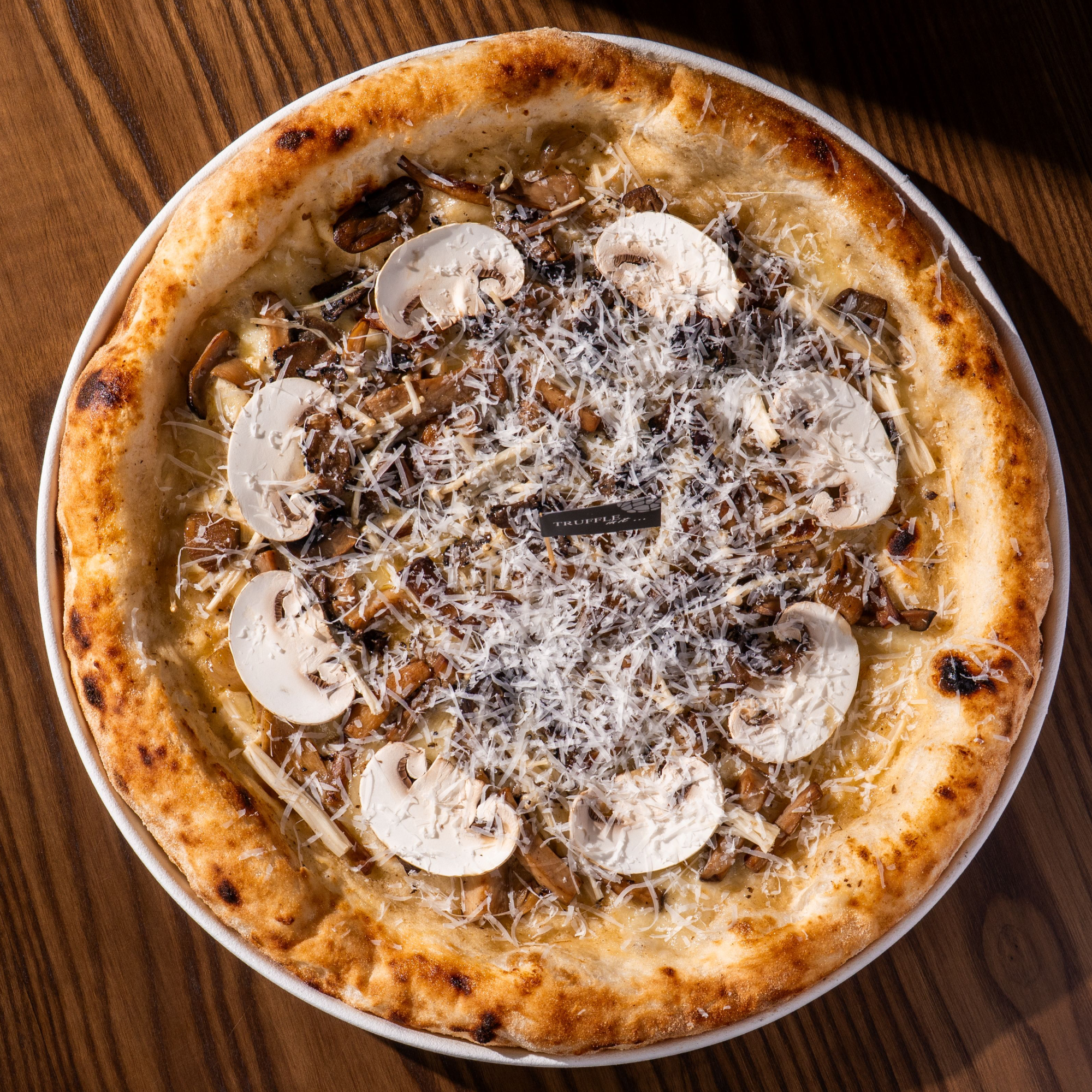 Five Mushroom Pizza with truffle, fior di latte, truffle cream sauce.