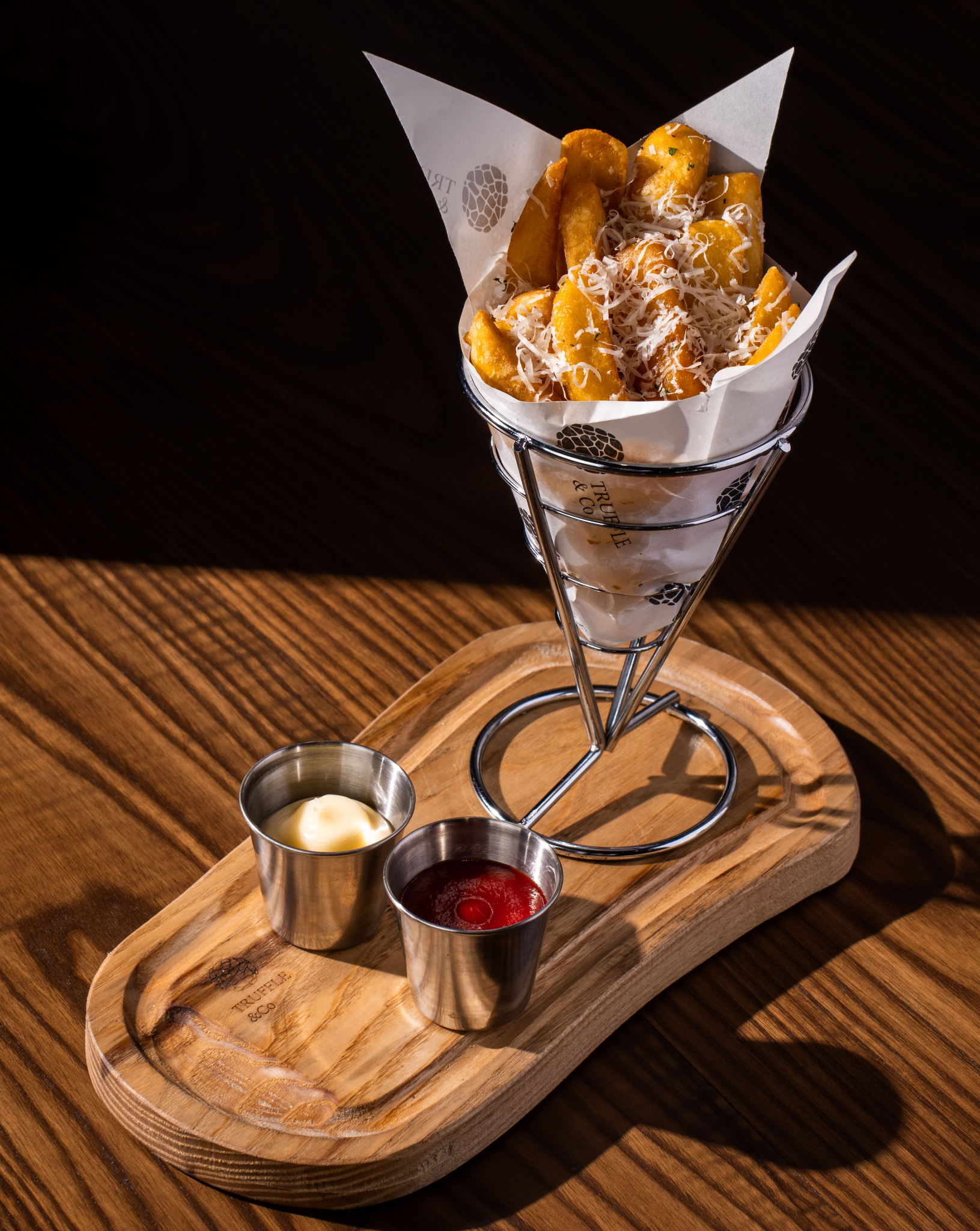 300g black angus flap steak, creamy mushroom sauce, truffle paste, truffle oil