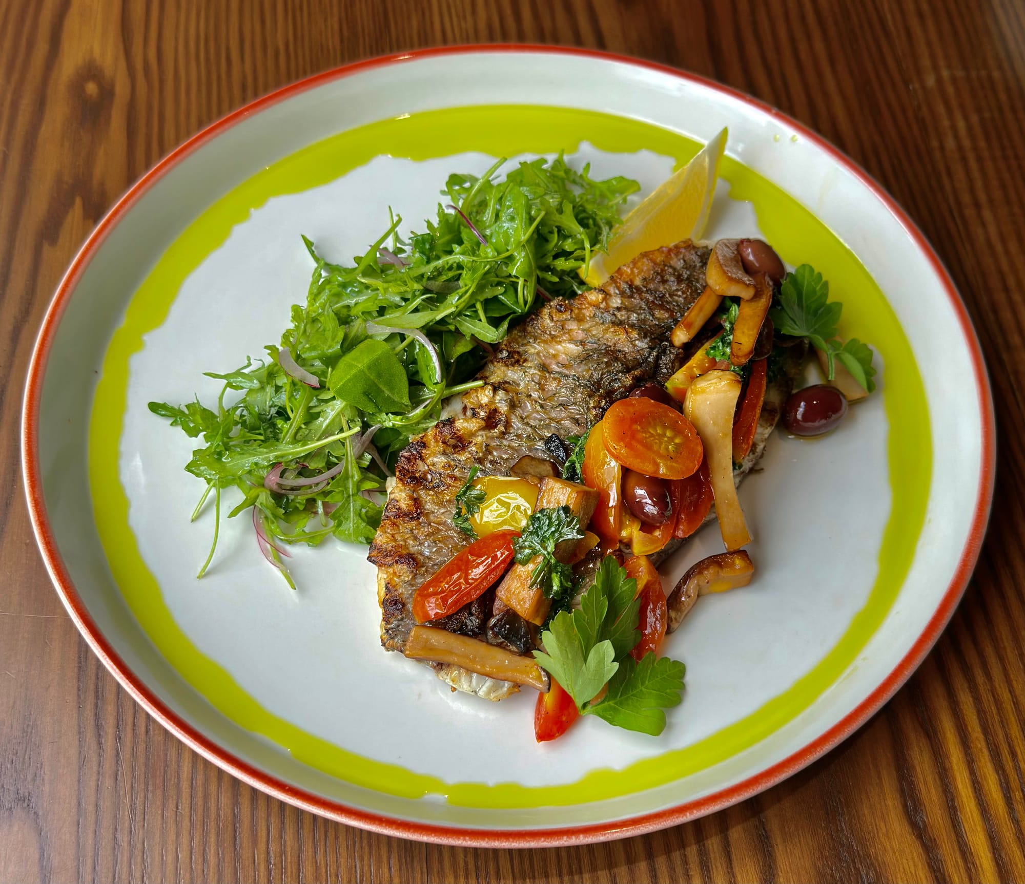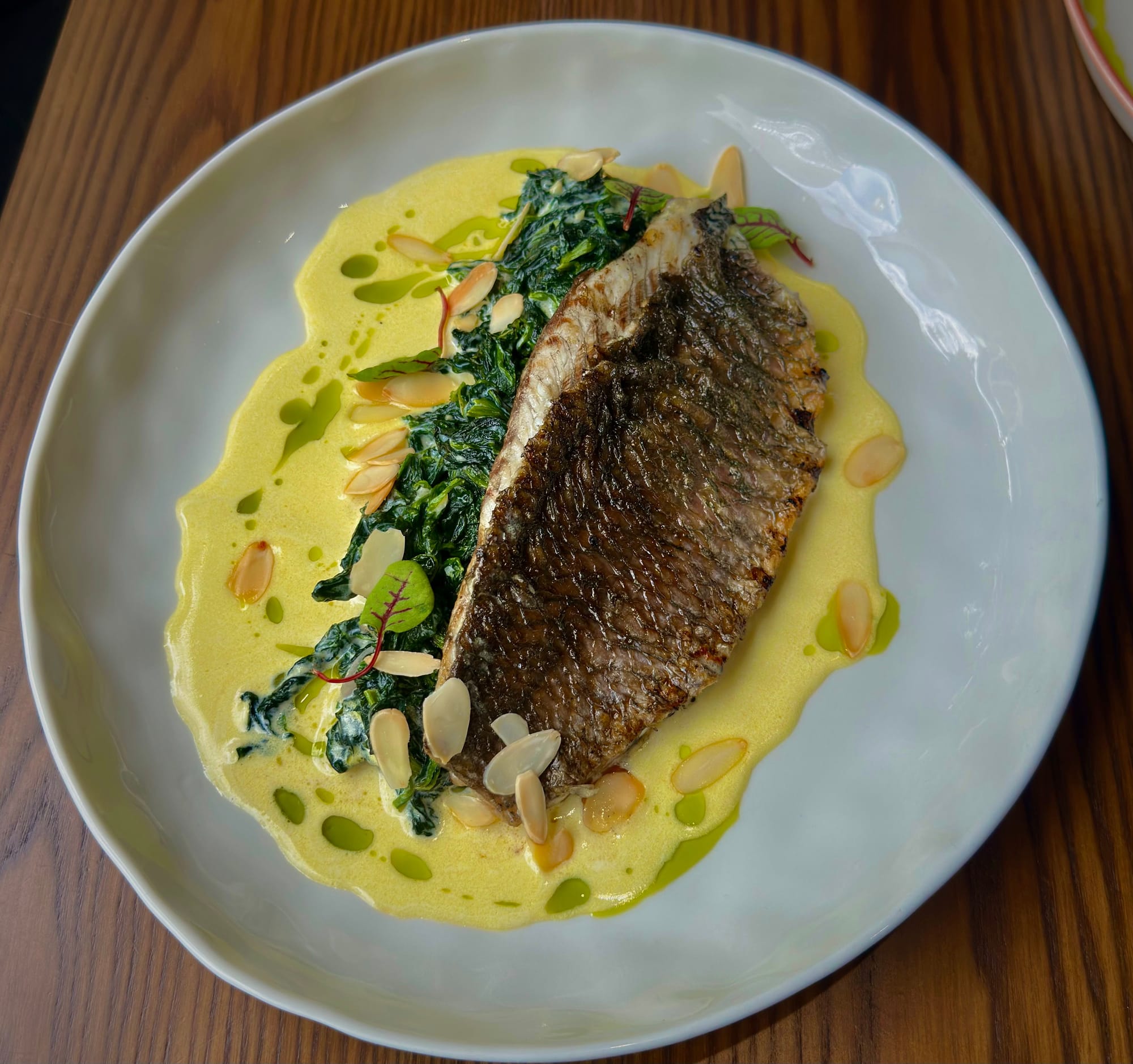Seabass fillet, creamy spinach, almond flakes, lemon-cream sauce