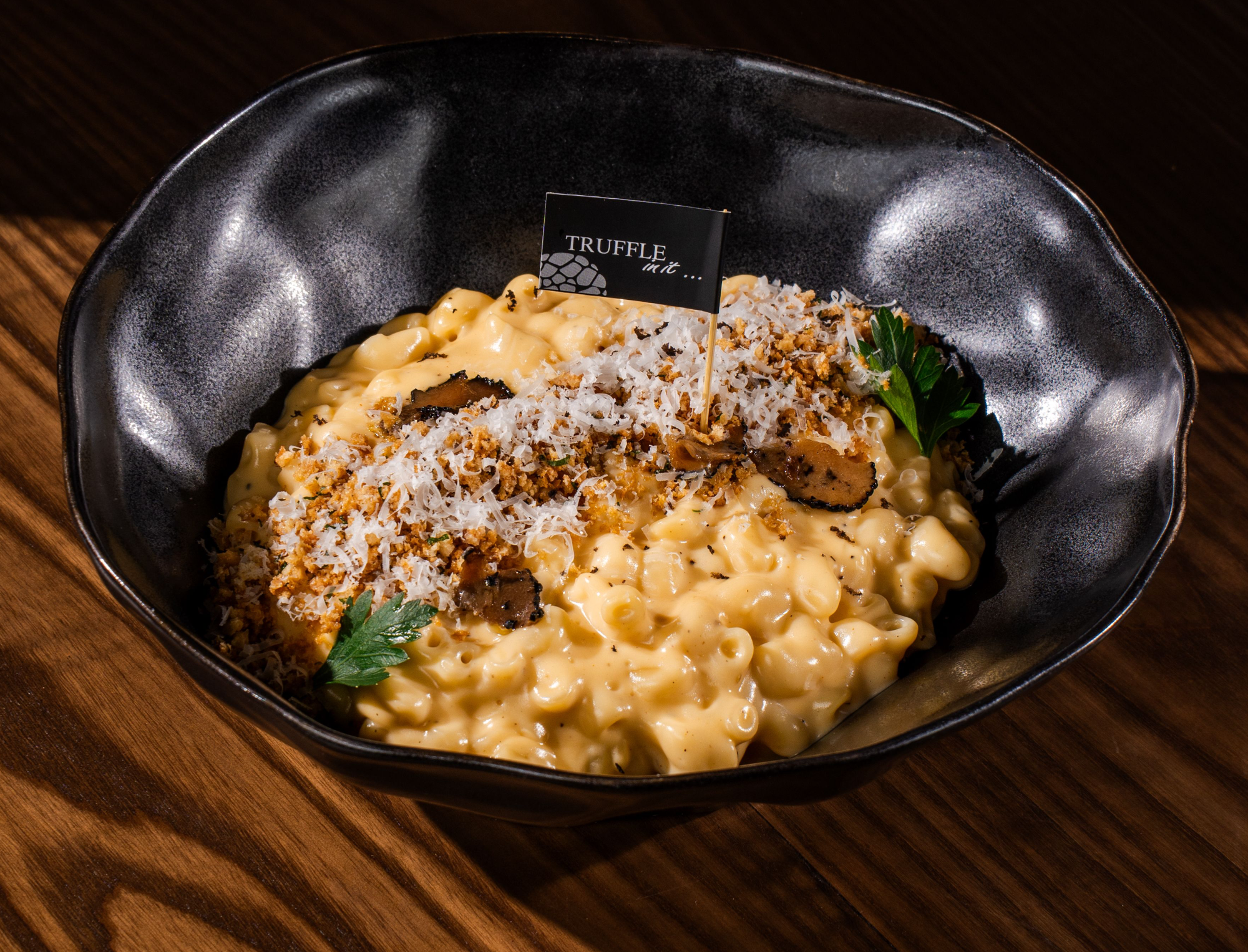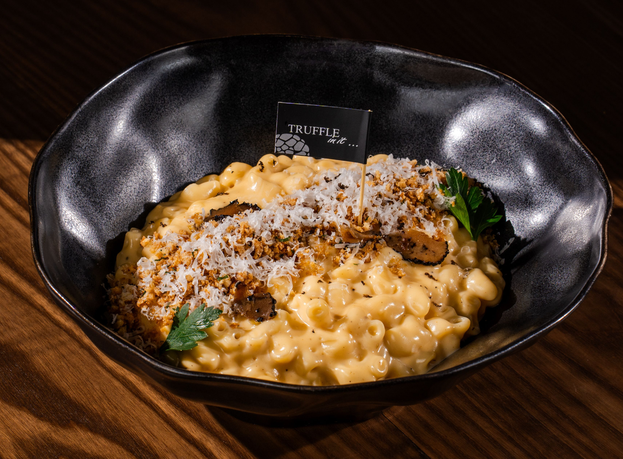 cheddar cream pasta, truffle carpaccio, parmesan, bread crumbs