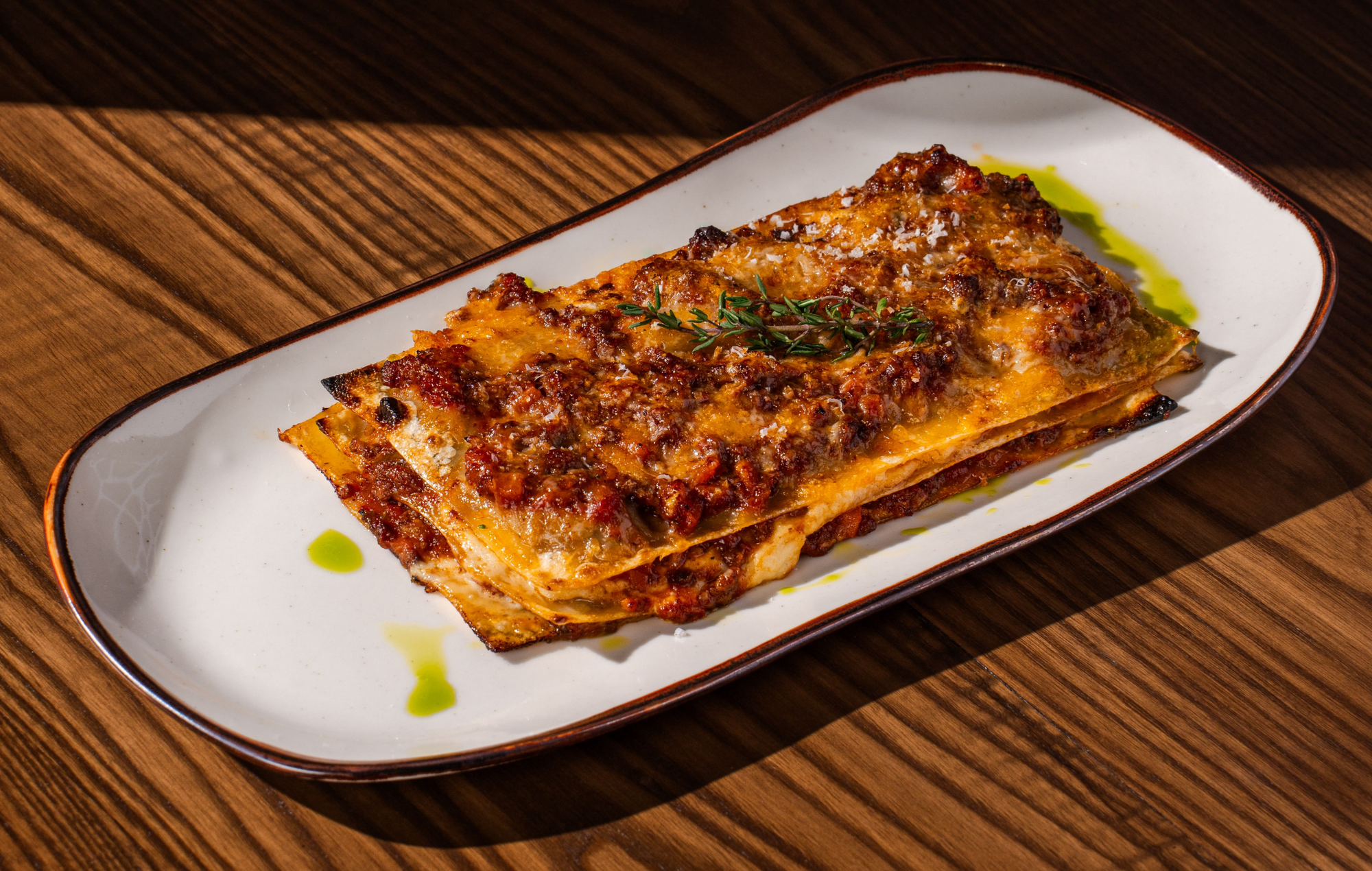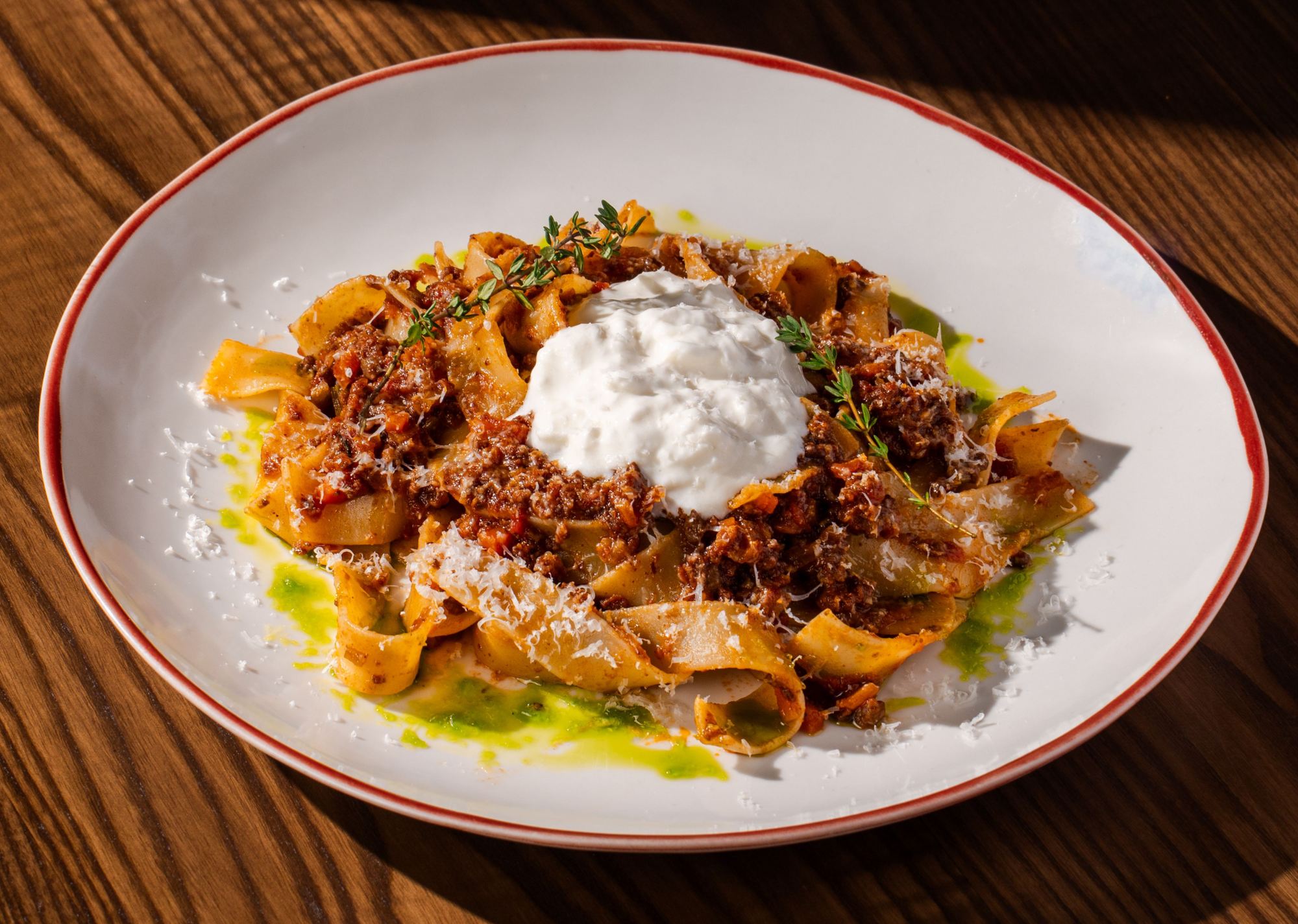 pappardelle pasta, wagyu bolognese sauce, stracciatella cheese, parmesan