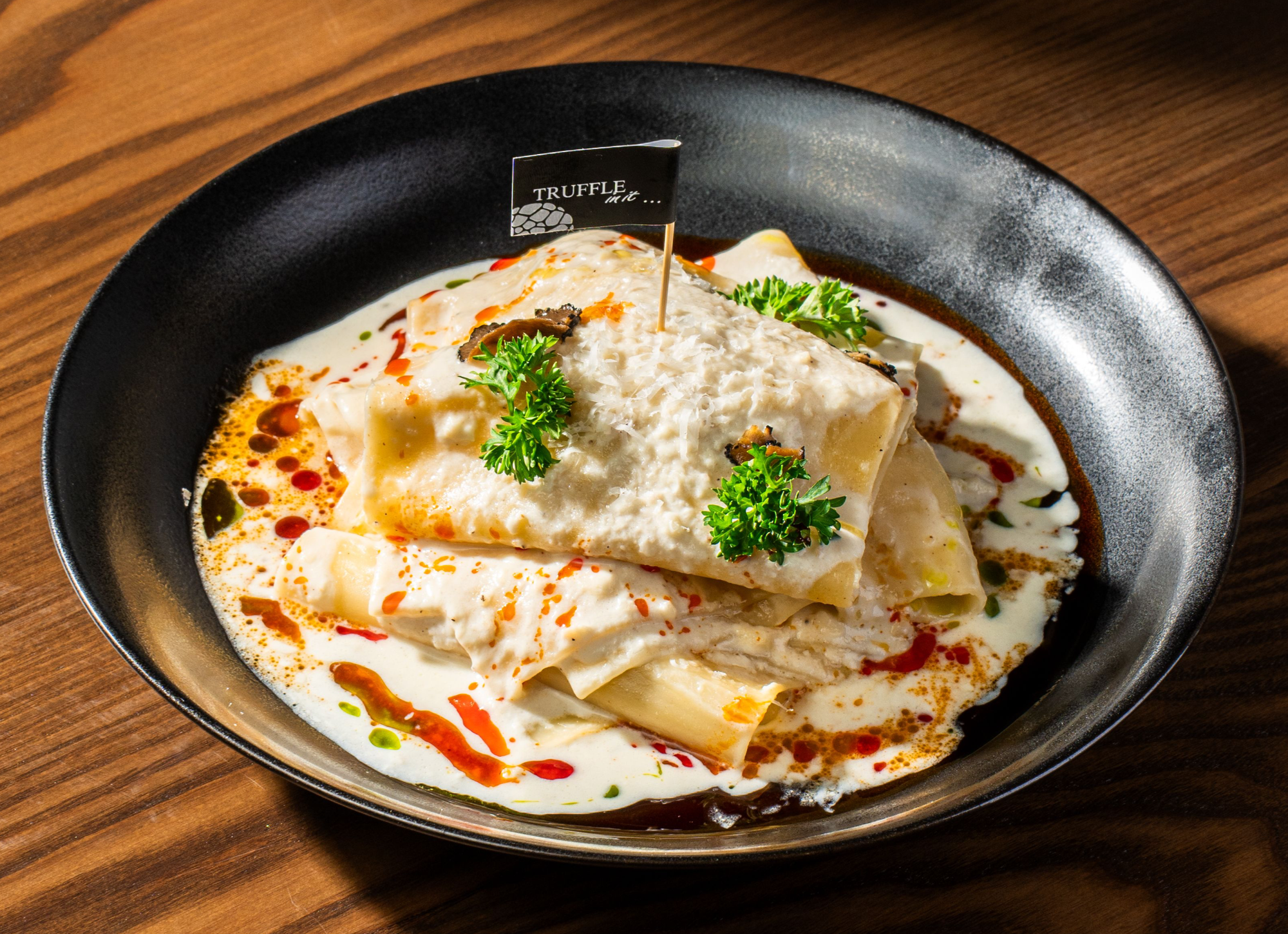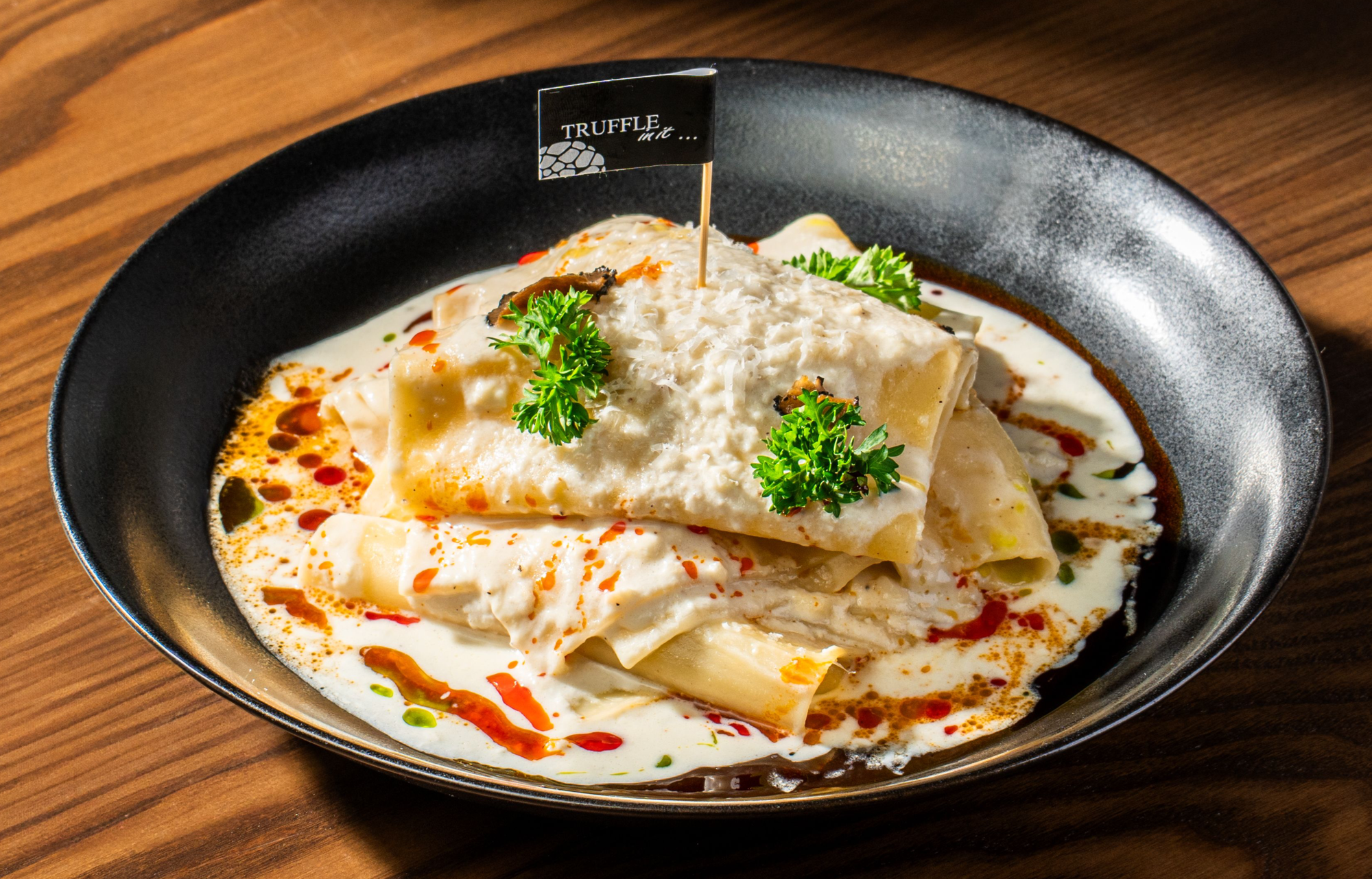 potato pasta, truffle cream sauce, truffle carpaccio, parmesan cheese